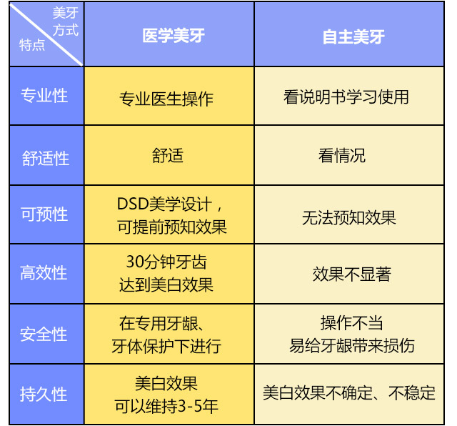 现在市面上很容易买到各种自主美牙产品如:美白仪、美白牙托等等,它们与医学美白有什么区别呢?