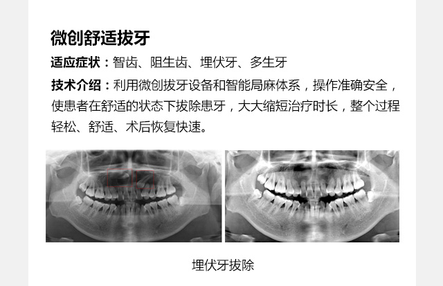 牙博士口腔外科是以手术方式为主解决口腔疾病的科室。开展各项口腔颌面常见疾病手术,有微创无痛、舒适的特点。口腔外科科室设备先进,医护人员技术精湛,掌握国内外先进的诊疗方法,对口腔颌面各常见病、多发病、疑难病如埋伏牙拔除、口腔肿瘤、囊肿切除、口腔脓肿切开引流、唇舌系带异常矫治、颌骨骨折复位固定等能够进行全面有效诊断、治疗和康复。